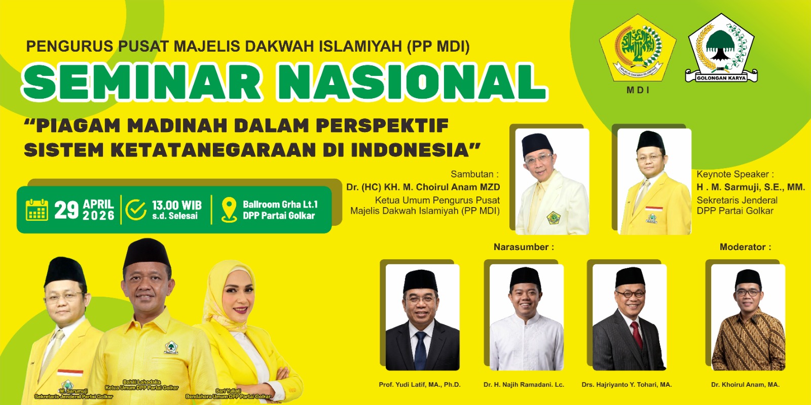 Kegiatan yang akan dilangsungkan pada Rabu, 29 April 2026 di Aula DPP Partai Golkar ini dirancang untuk mengkaji nilai-nilai historis Piagam Madinah dalam konteks sistem ketatanegaraan modern Indonesia yang berlandaskan Pancasila dan UUD 1945.
