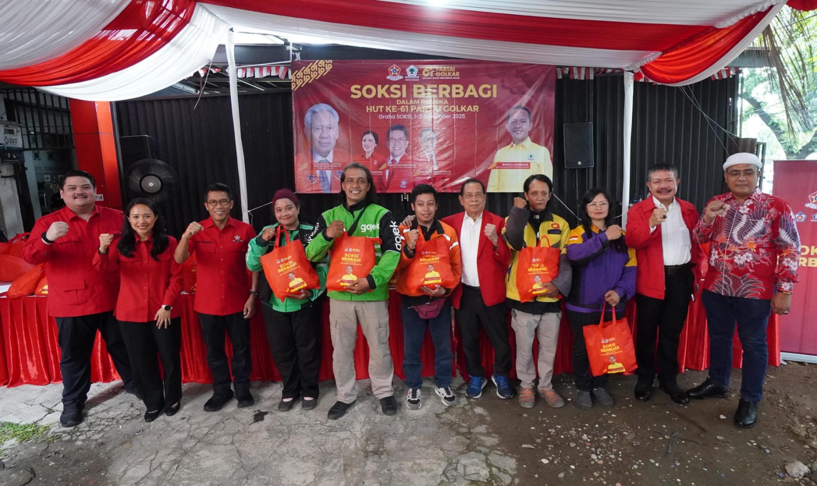 Dalam rangka memperingati Hari Ulang Tahun (HUT) ke-61 Partai Golkar, Dewan Pimpinan Nasional Sentral Organisasi Karyawan Swadiri Indonesia (Depinas SOKSI) menggelar kegiatan sosial bertajuk ‘SOKSI Berbagi’ dengan menyalurkan 5.000 paket sembako kepada masyarakat, termasuk diantaranya 1.600 paket untuk komunitas ojek online (ojol).